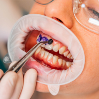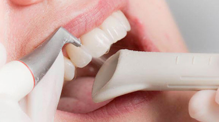 Pulizia dei denti con tecnologia laminare guidata Air Flow che grazie alla GBT (Guided Biofilm Therapy) permette di rendere visibile il biofilme quindi dio rimuovere completamente il biofilm anche nelle aree più difficili permettendo al paziente di seguire una migliore igiene orale domiciliare.